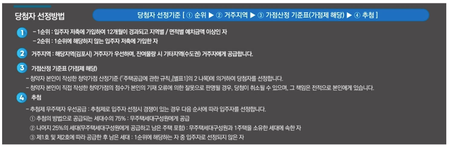 - 거주지역 : 김포시 거주자가 우선, 잔여물량 시 기타 지역 (수도권) 거주자에게 공급