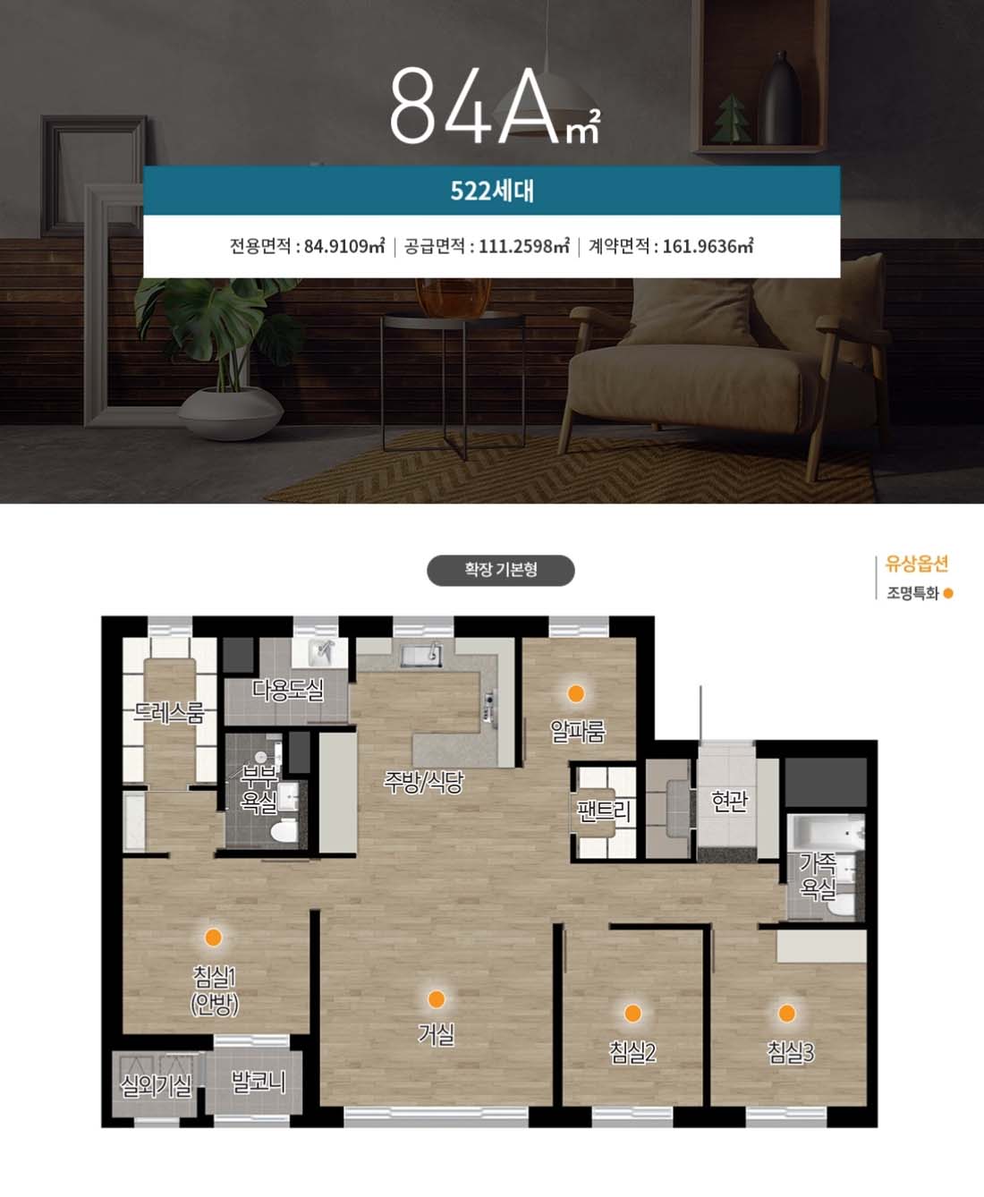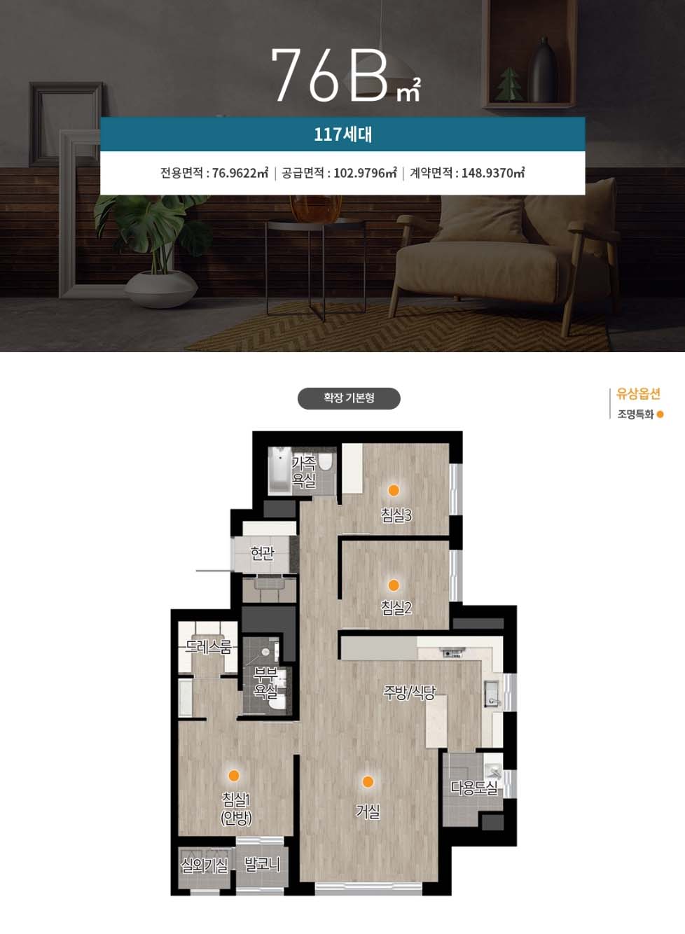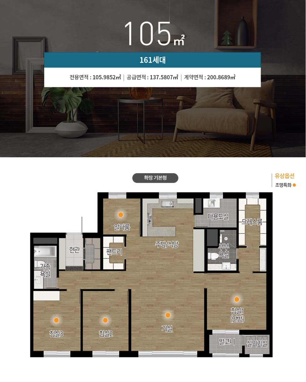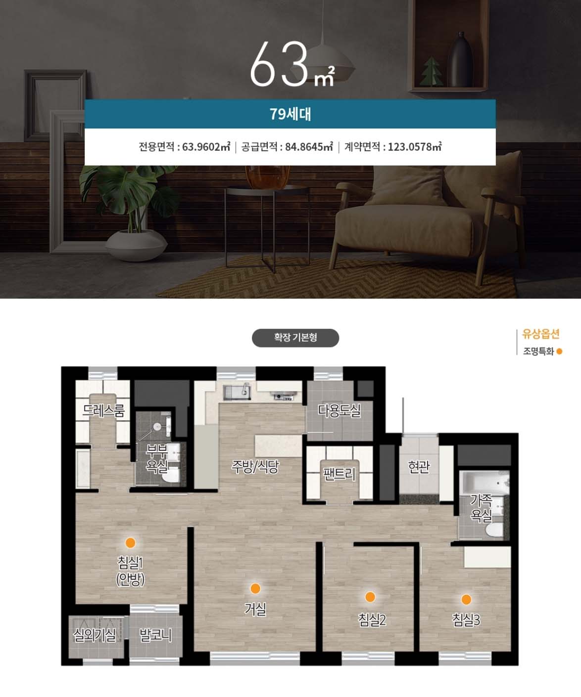 - 침실 : 강마루 바닥, 드레스룸 (침실1), 화장대 (침실1), 붙박이장 (침실3)