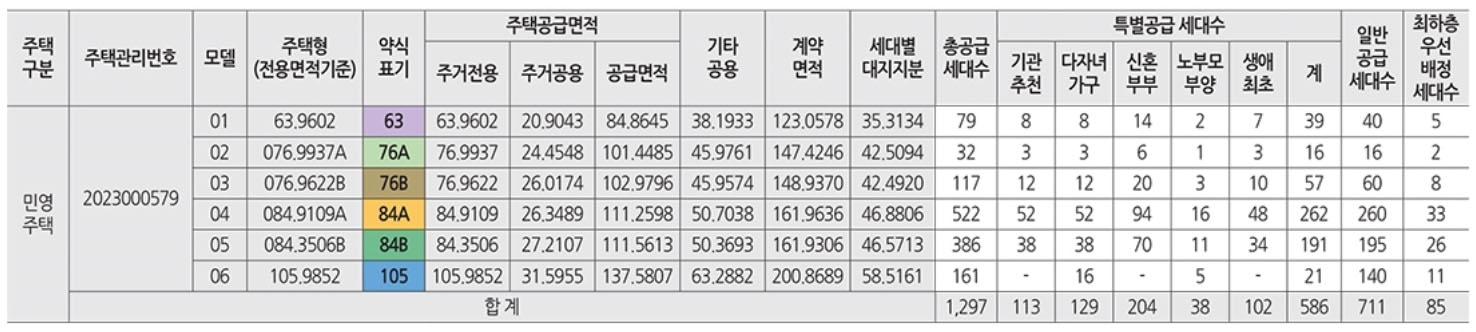 특별공급 및 일반공급에 따른 타입별 주택면적은 아래 표를 통해 확인할 수 있으니 청약 신청 시 참고해 주시면 됩니다.
