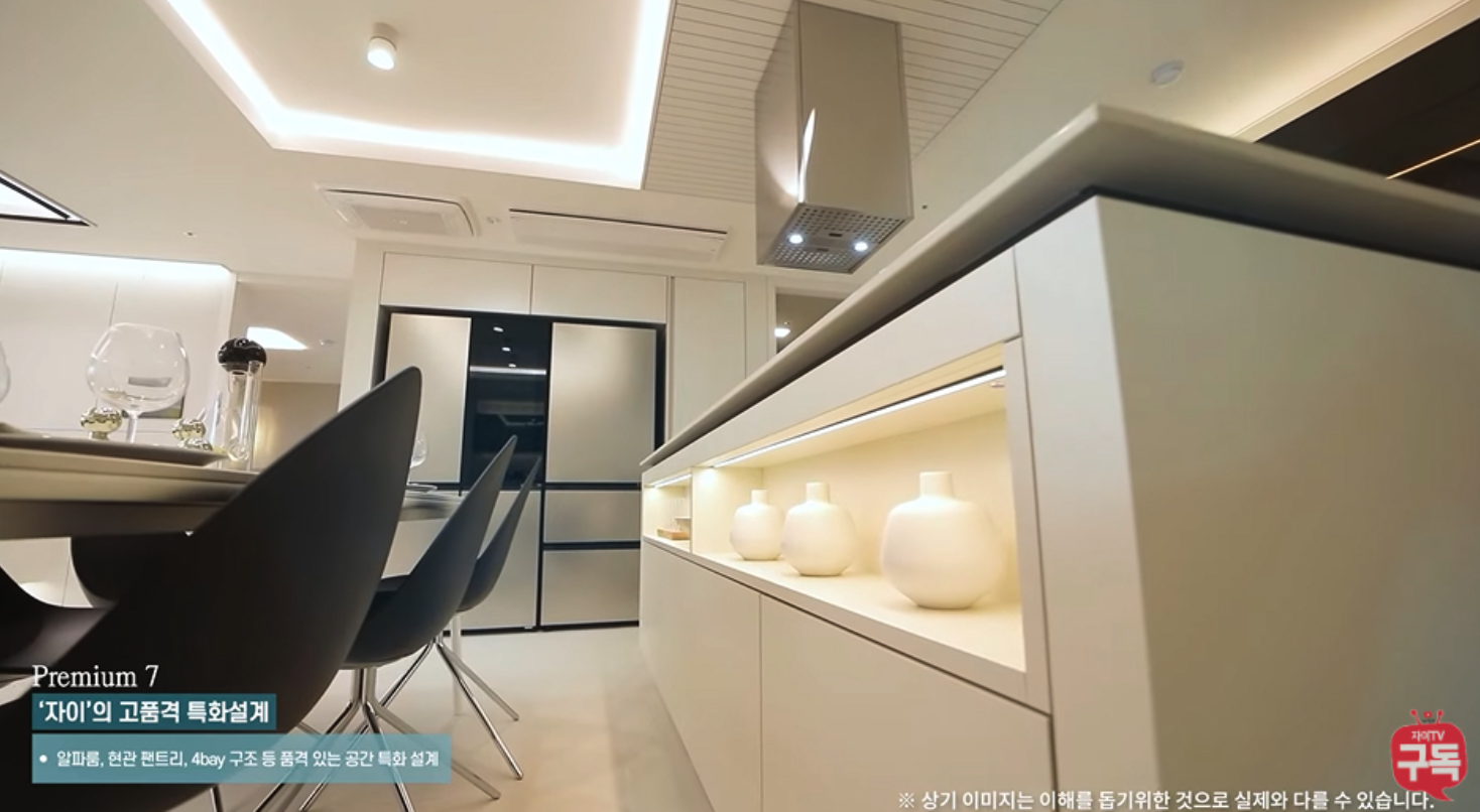 - 주방 : 강마루 바닥, 엔지니어드스톤 주방상판, 3구가스쿡탑, 렌지후드, 음식물탈수기, 사각싱크볼, 우물천장, 주방 TV (10인치), 절수페달, 냉장고장