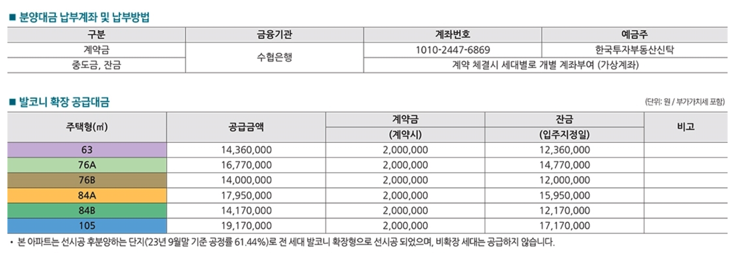 기본 분양가는 이렇게 형성돼 있고, 만약 발코니를 확장할 경우 1천만 원 이상의 추가 비용이 더 발생하기 때문에 참고하여 분양가 정보를 파악해 보시길 바랍니다.