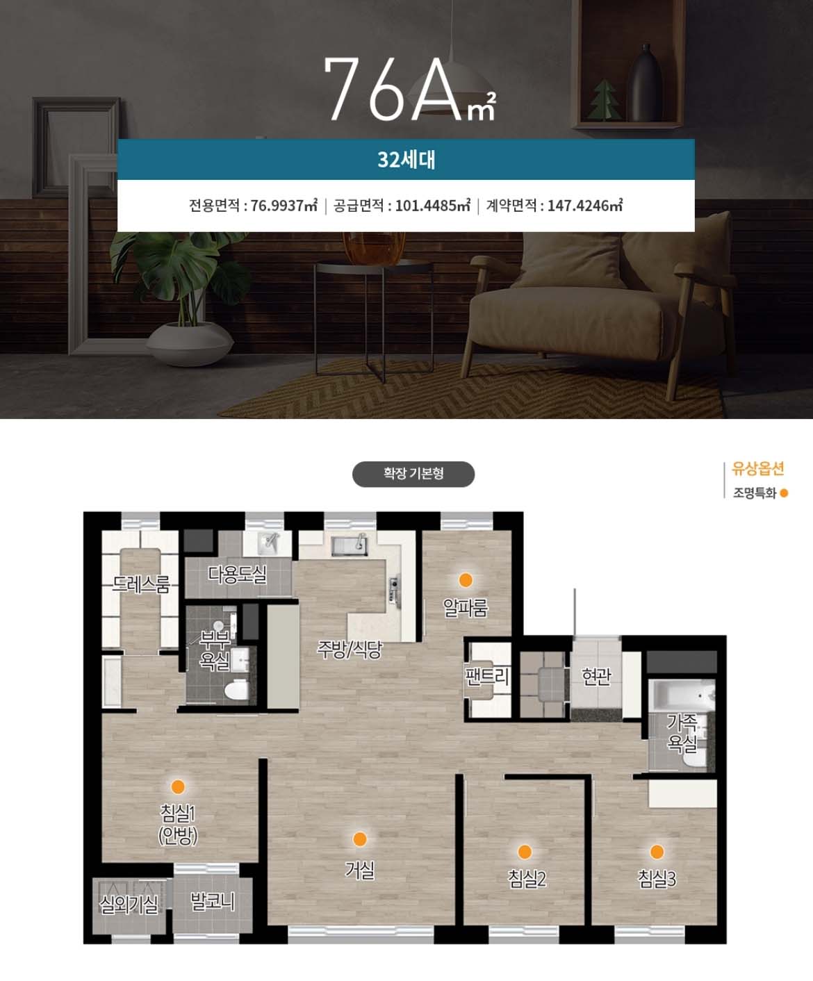 그 밖에 가장 적은 세대수를 차지하고 있는 타입은 76A로 자세한 건 아래 평면도를 확인하여 곧 공개하게 될 견본주택에 방문해 보시길 바랍니다.