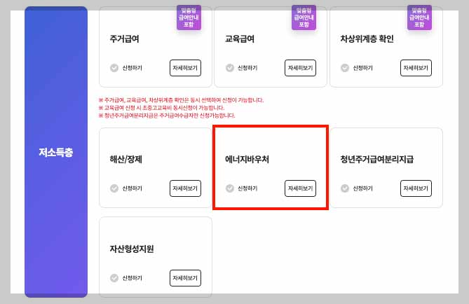 - 에너지 바우처를 받지 못한 생계·의료급여형 수급자, 교육형 수급자, 주거형 수급자