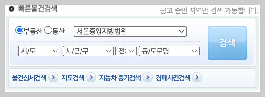 우선 대법원 법원경매정보 사이트 메인 화면 중앙에 '빠른물건검색'이라는 작은 검색창을 확인하실 수 있을 겁니다. 바로 이 검색창을 통해 본인이 원하는 지역의 경매물건을 빠르게 검색할 수 있는데요.