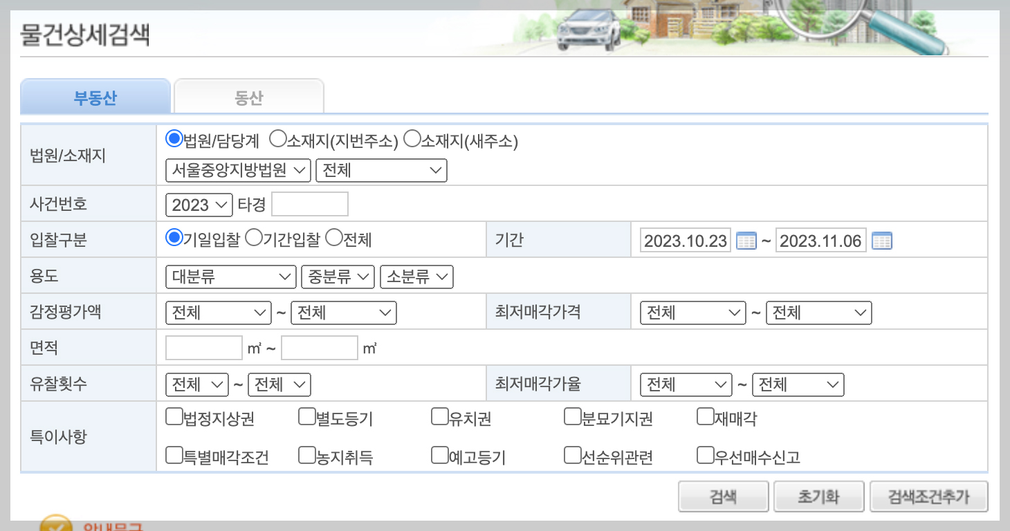 해당 경매물건 탭에서는 경매에 넘겨진 물건에 대한 상세 검색과 그 외 지도별, 기일별, 자동차 및 중기 등 세부 카테고리에 맞춰서 검색할 수 있는 기능이 들어가 있습니다.