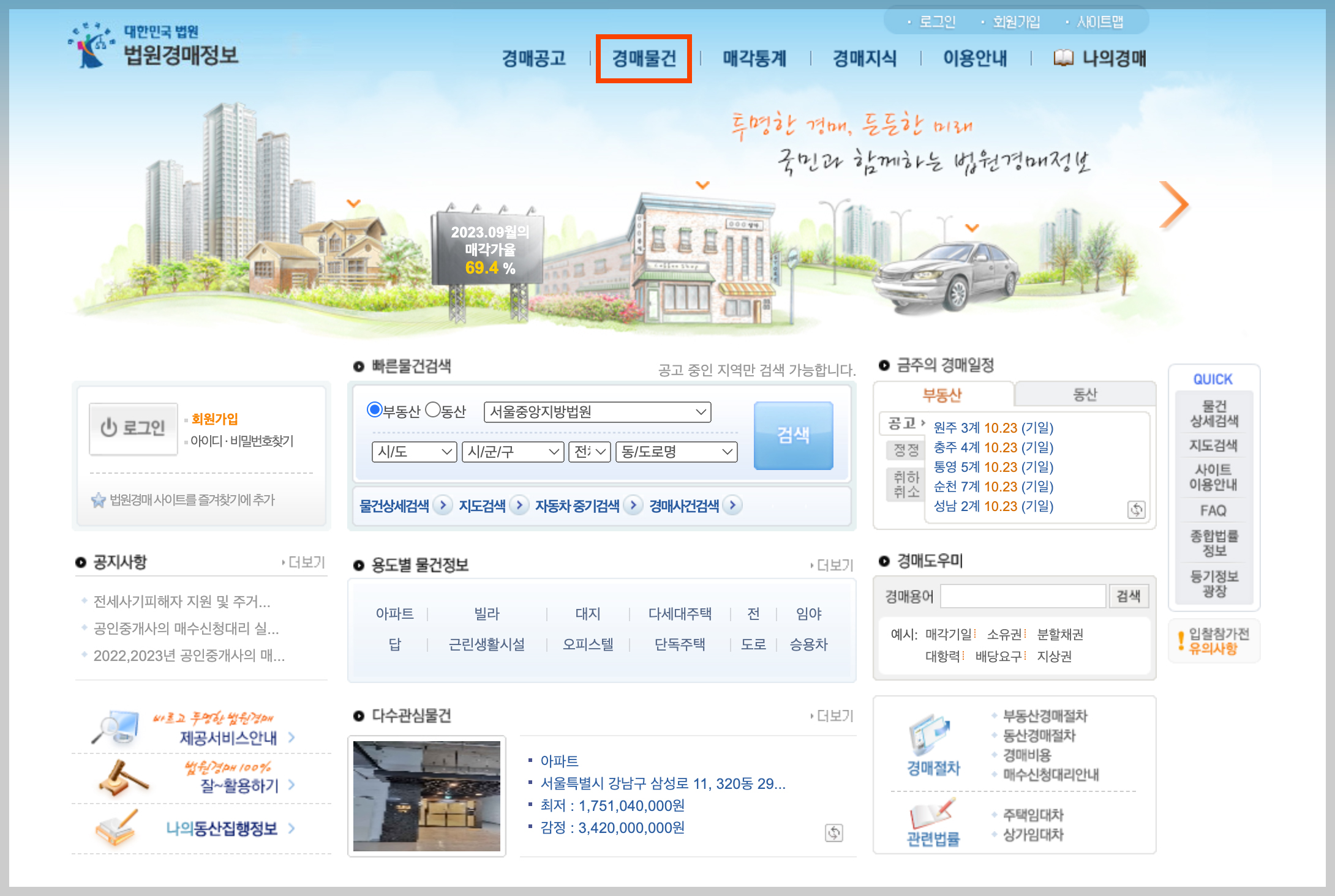 상단의 대법원 법원경매정보 사이트에 접속해서 회원가입을 한 뒤 메인 홈페이지를 보면 상단에 '경매물건'이라는 카테고리 탭을 확인할 수 있는데요.