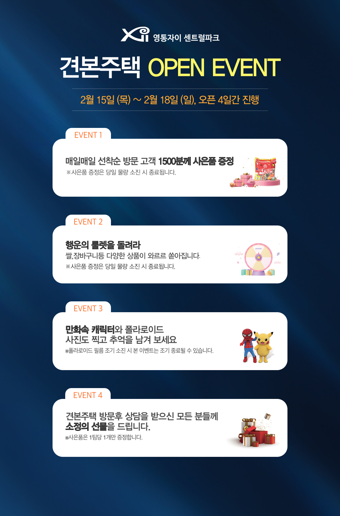 앞서 말씀드린 영통자이 센트럴파크 모델하우스 오픈기념 이벤트는 아래 내용을 참고해 주시면 되는데요. 총 4가지의 이벤트를 진행하고 있으니, 모델하우스 구경도 하고, 상품도 받아오시면 될 것 같습니다.
