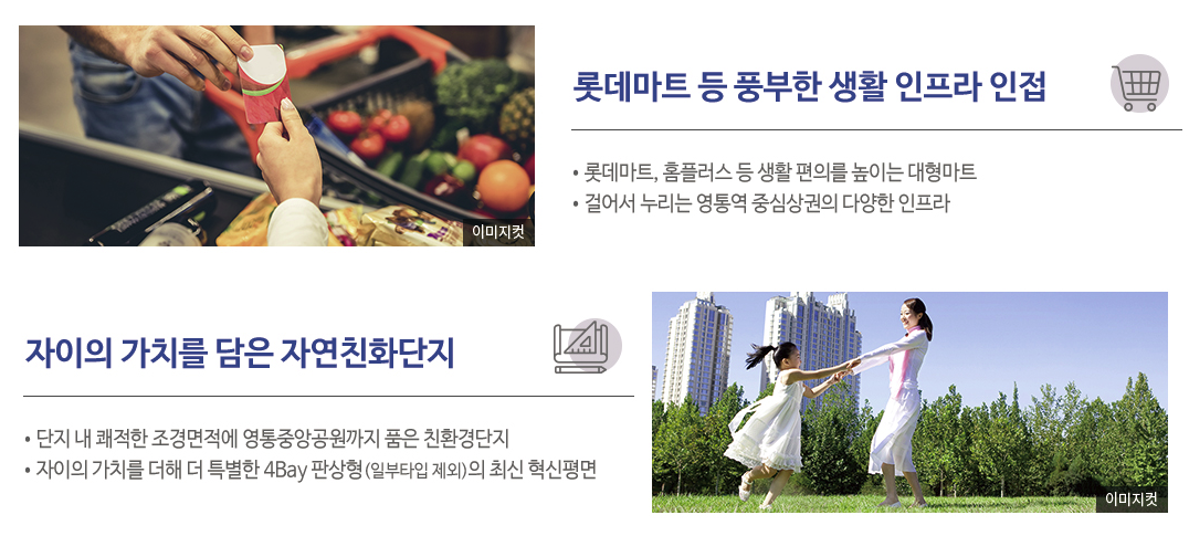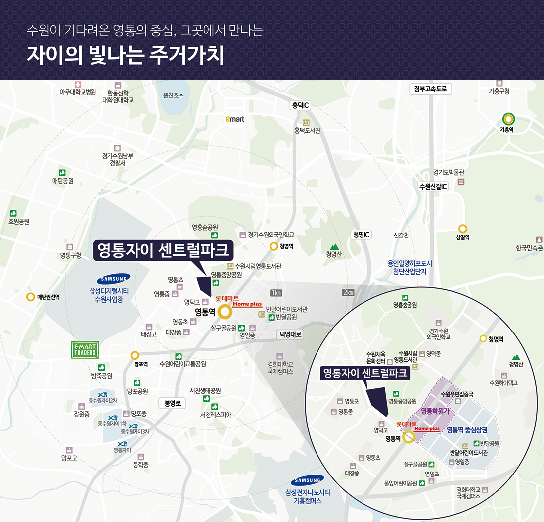- 생활환경 : 홈플러스, 롯데마트, 아주대학병원, 영흥공원 / 자원회수시설, 소각장으로 소음 발생 우려 (그래서 영통자이 센트럴파크에는 전세대 전열교환기 및 공기청정기 기본 옵션 포함)