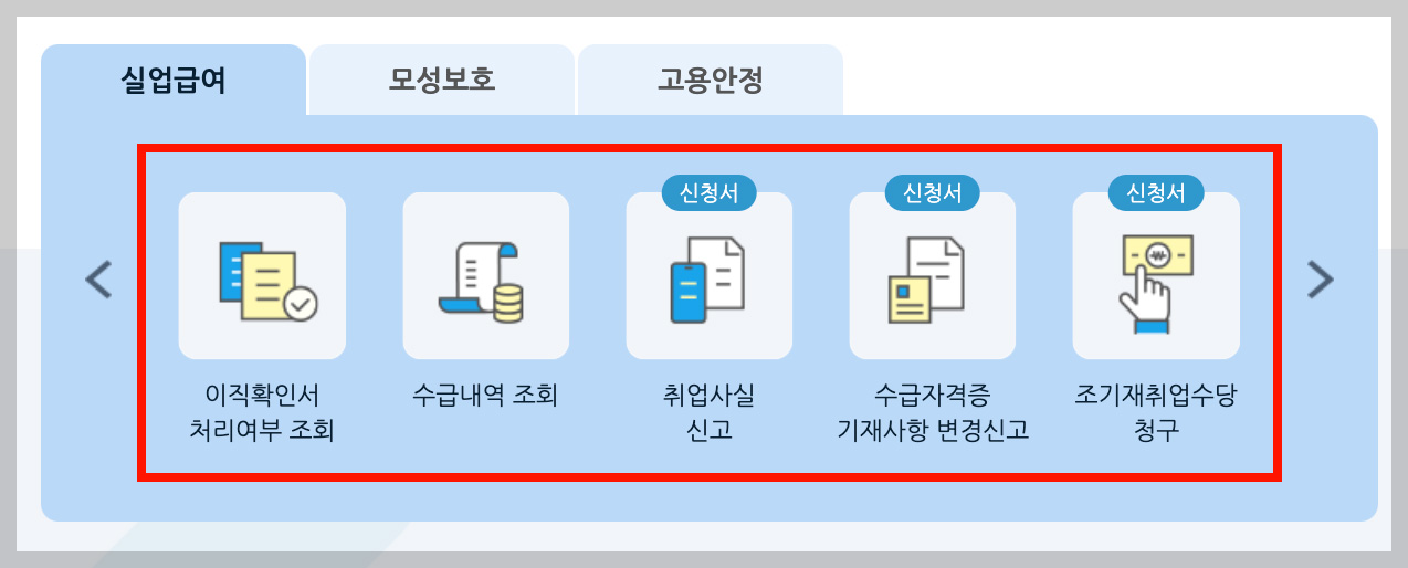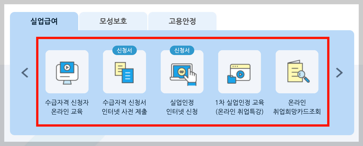 고용보험 홈페이지 접속 ▶ 온라인 교육 이수 ▶ 실업급여 신청서 제출 ▶ 심사 ▶ 실업급여 수급