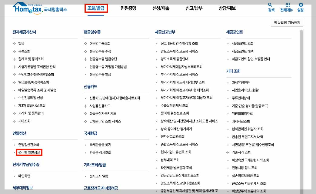 - 조회/발급 ▶ 연말정산 ▶ 편리한 연말정산 클릭