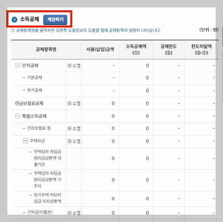 - 소득 세액 공제 확인 ▶ 세액 계산 항목 클릭